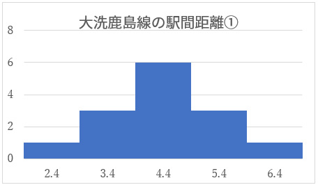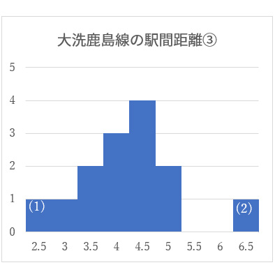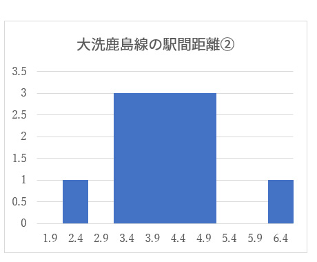 授業では生徒の身近な生のデータを活用したいと思い,いくつかのデータを準備した。この授業で使用したのは本校の地元を通る「大洗鹿島線」のデータである。この路線は人気アニメ「ガールズ&パンツァー」のラッピング電車で有名である。大洗鹿島線を運営する鹿島臨海鉄道株式会社は茨城県内で貨物および旅客鉄道事業を行う第三セクターである。大洗鹿島線と鹿島臨港線の2路線を保有しているが,鹿島臨港線は貨物専用であるため,一般の方々には水戸駅と鹿島サッカースタジアム駅を結ぶ大洗鹿島線の方がよく知られている。本校の最寄り駅が大洗鹿島線の「大洗駅」であり,この路線を利用したことのない生徒はまずいない。そこで先述の新幹線にあやかって「各駅間の距離」のヒストグラムを作成した。