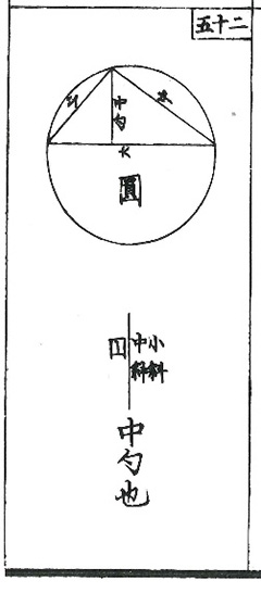 図3は助術の25番です。現代でいう「正弦定理」に相当するものです。三角比が使えませんので,直角三角形の線分比を用いて記載されています。これも,教科書であれば直径を斜辺とする直角三角形を描いて「円周角の定理」で証明するところですが,現代においては少しなじみにくい補助線を引いて証明しています。