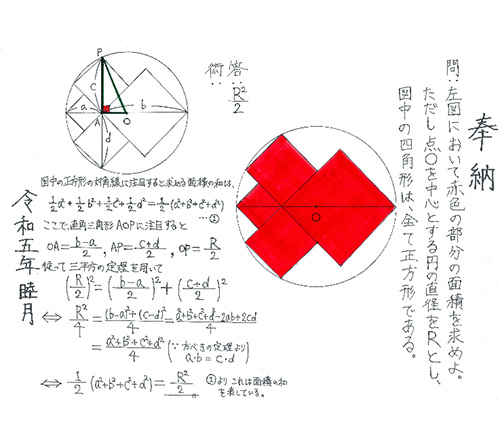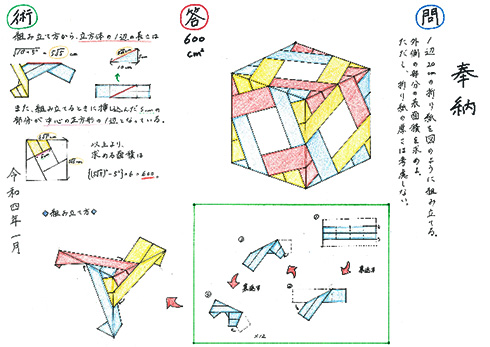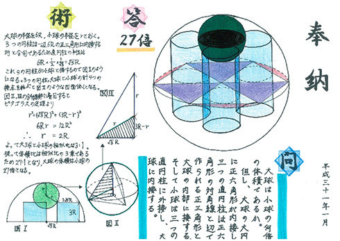 1つ目は,初稿(夏休みの宿題)時点ですでに完成しているものです。図5は完成版ですが,2学期に行ったことは,色やレイアウトの微調整のみです。校章をモチーフに空間図形の問題を作る,という明確な意思を持って取り組んでいました。打ち合わせでも,算額の問題検討より数学の雑談の時間のほうが長かった印象があります。ただし,図の色合いや問題,答え,図のレイアウトの方法についてはオーソドックスな算額の表現に忠実です。むしろ,その部分で奇をてらわない方が作品としての質が高まる,と判断しました。