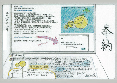 時節のことがらは,あまりにも典型的だと他の生徒と「カブって」しまうので,その匙加減が難しいです。図7はコロナ禍の直前での作品であり,東京オリンピックを題材にしています。使っている公式自体は1学期に学んだ『算法助術』にも掲載されている公式です。ここでは公式の詳細には触れずに,オリンピック前に台風が来る,それを防ぐためにパソコンの画面に指令が入るという物語を採用しています。画面のフォントへのこだわりや,キーボード部分の描写の取捨選択など,徹底的に私や他の生徒たちに聞き取りを行って見やすくし,物語に入っていくように工夫しています。