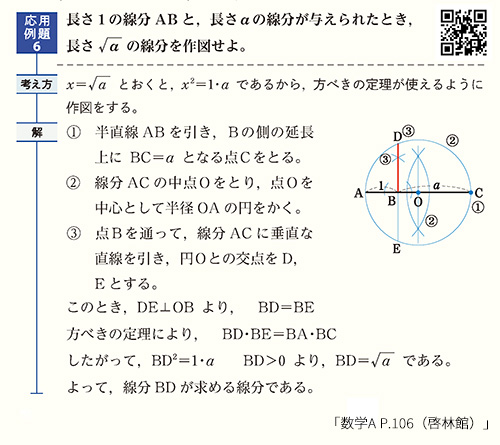 問題作成に悩んだ場合に教科書を見る生徒も多いです。もちろん,そのまま問題を写すようでは感心しませんが,多数の執筆者が関わっているということで,教科書はよきお手本です。示唆に富む図も多いです。図9は最近の作品です。図10にある教科書の作図問題からヒントを得ています。数学Aの作図解の授業,数学研究での「さしがねによる作図」の授業といったところに感銘を受けており,それを形にしています。過去の経験がふとした形で活かされることがあるのも,算額の面白いところです。