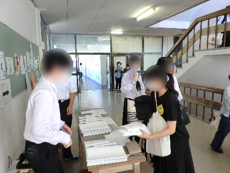 次の写真は問題集の販売風景である。多くの人が通る場所に販売場所を設定したのもよかったようである。