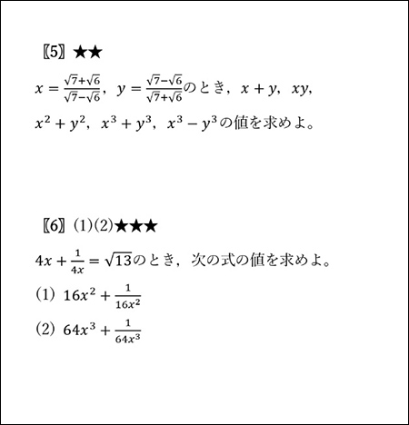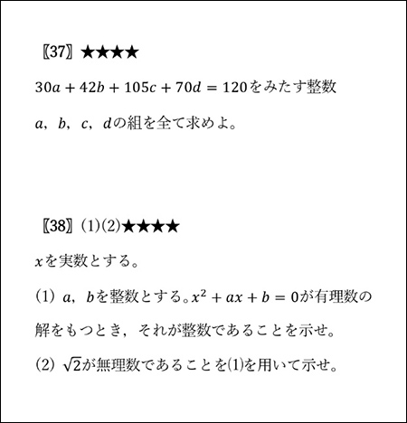研究テーマは各自自由であるが,今年度前半は①大阪府立大手前高等学校で開催されるマスフェスタで研究成果を発表する②徳高祭(文化祭)の恒例イベントである「徳山高校 因数分解コンクール」用の問題を作成する③数学の問題集を作成し,徳高祭で販売する3つをメインにして活動した。①については,2023年11月で,②について(ただし昨年度版)は2022年12月に紹介したので,本稿では主に③について紹介したい。