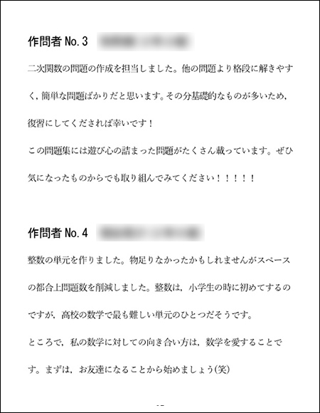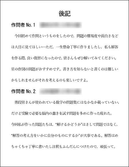 それぞれの問題編の後ろには「後記」が掲載されている。高校生(科学部数学班)がどんな気持ちで作成したかがよくわかる。