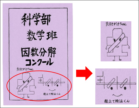 因数分解コンクールは今回で3回目となり,科学部数学班の出し物として認知されるようになった。文化祭では文化部や各クラスの出し物を周知,PRするためのパンフレットが配布されるが,数学班は右下のような因数分解に付き物の「たすき掛け」や「組立除法」に因んだキャラクター「たすきがけちゃん」「組立て除法くん」を作ってPRをした。