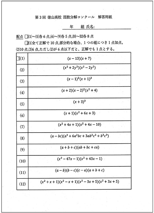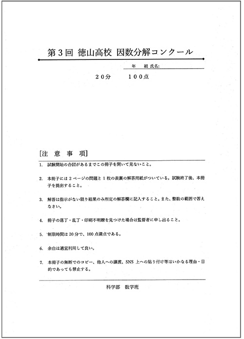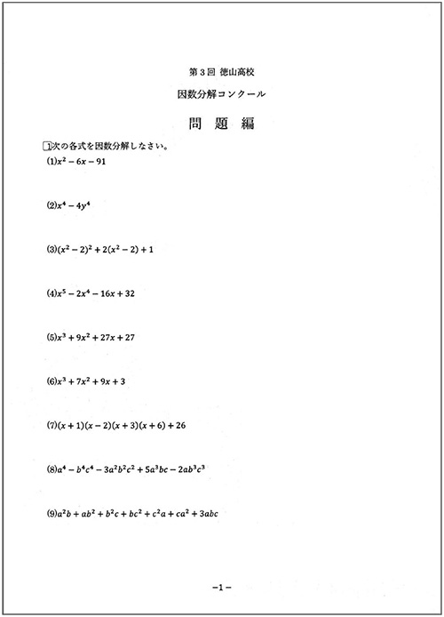 本校に赴任して2年目であるが,「徳山高校 因数分解コンクール」は今年で3回目,つまり本校赴任1年前に始まった。当時,本校科学部数学班2年次生のN君が始めたということである。N君は現在某国立大学の理学部数学科に籍を置いている。