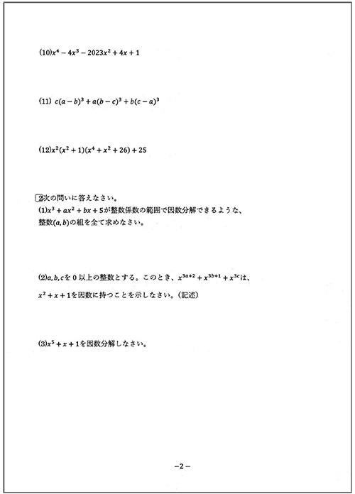 2022年度の問題については「因数分解コンクール~科学部数学班の文化祭での出し物~」をご覧いただきたい。結構マニアックな問題が多くあり,制限時間も短いために正答率は高くなかった。その反省も踏まえて,難易度を少し下げて取り組みやすい問題も入れようということになった。