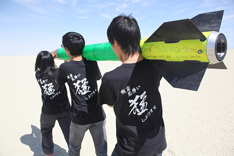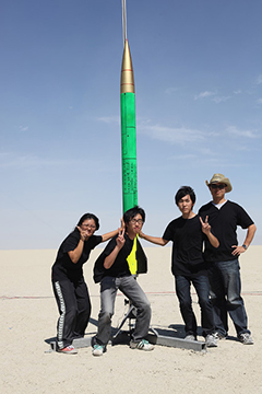 <高度3kmまで飛翔する大型ロケットの前にて>