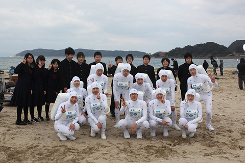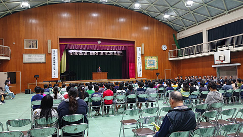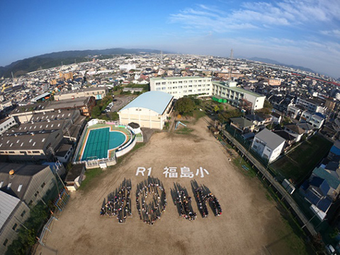 私の子供が通う地元の小学校から講演依頼があり,「福島から世界へ 缶サット世界大会に出場して」というタイトルで小学生や保護者,地元の人に対して缶サット甲子園や科学部の取り組みなどの紹介をさせてもらった。また,小学校のグラウンドにて,40thの人文字のドローン撮影も行った。