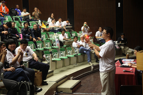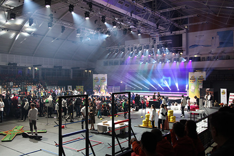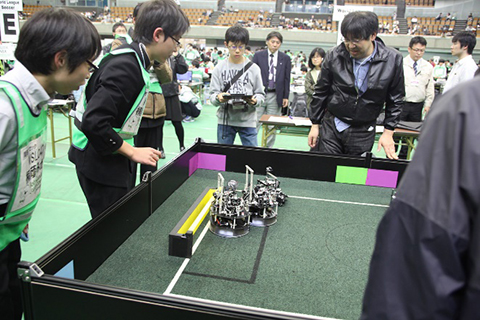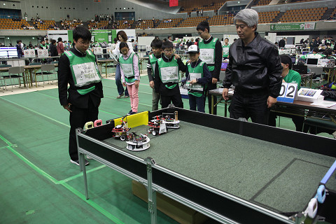 サッカー競技は2台のロボットを自作し,そのロボットに攻撃や守備のプログラムを入れ,ロボットの状況判断のみでサッカーを行う自律型ロボットによる大会です。試合開始時に選手がスタートボタンを1度押すのみで,その後はロボット2台同士が自動でサッカーの試合をします。機械工作やプログラミングなど多くの知識や技術が必要となります。