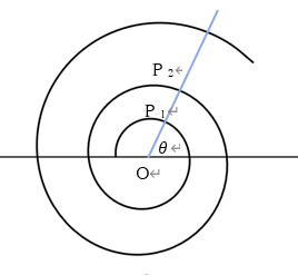 ここでrは定点Oから動点Pまでの線分(動径)の長さ,θはラジアン単位で測った基準線と動径とのなす角である(図1)。今回の授業の時点では,数学で自然対数の底e(ネイピア数)を学習していないこともあり,螺旋が基準線を横切る(