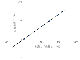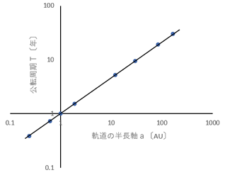 理科年表(2014)に掲載されている各惑星の公転周期T〔年〕と公転軌道の半長軸a〔AU:天文単位〕の関係を両対数グラフ用紙にとると,直線上に乗る(図4)。このグラフを解析することで,