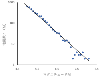 地震・火山の事典(1993)によれば,「大地震は滅多に起こらないが,小さい地震はときどきある。このような経験的事実を数量的に表現したのが,グーテンベルグ・リヒター(Gutenberg・Richter,1941)の地震の規模別頻度に関する式である。ある地域で,ある期間に発生する地震のマグニチュード(M)別の回数n(M)はほぼつぎの式で表わせる。