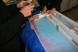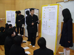 その後,仮説発表会で明らかになった問題点等をふまえ,実験計画を修正して本実験を実施。各班が行った実験では,流水を観察して渦のでき方を観察する班や,ドライアイスの気体をぶつけ合うことで渦のでき方を調べる班など,班ごとで工夫を凝らした実験を行い,その結果をディジタルカメラやディジタルビデオカメラを用いて記録した(図6)。実験結果は,情報科と連携して表計算ソフトを利用し,実験結果のまとめや解析を行った。さらに,研究の発表用資料としてのポスターをワープロソフトを利用して作成し(図7),そのポスターを使用し発表会を行った(図8)。