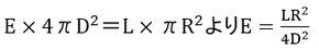 地球と太陽の間の距離(1天文単位)をD,地球の半径をR(6400km)とすると地球が太陽から1秒間に受け取るエネルギー(Eとする)は