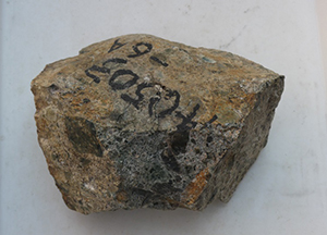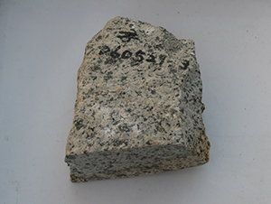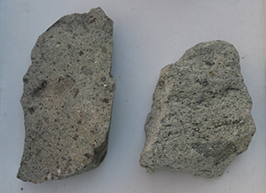 凝灰岩は主に火山灰が堆積して固まった堆積岩だが,これは深成岩。よく観察すると,含まれている黒いものは礫や砂ではなく鉱物であることに気づく。兵庫県南部姫路市から採取した。