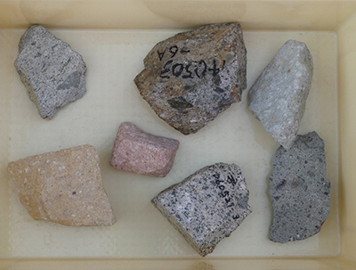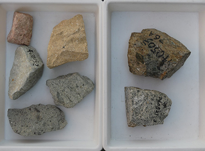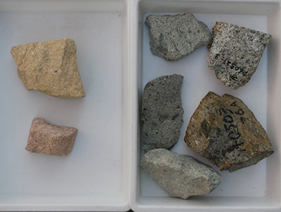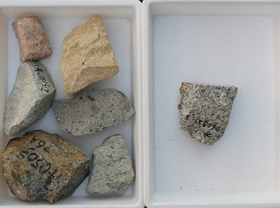 次に,先に示した花こう岩を除く6個の凝灰岩(図2~図4)を,兵庫県中部(加古川の上流側)から南側(下流側)の順に机に並べてみました。角礫凝灰岩(西脇市/図2)→粗粒凝灰岩(加西市/図3)→細粒凝灰岩(高砂市/図4)の順番です。そして,生徒にこう質問しました。「これらの凝灰岩は同じ時期に噴火した火山灰が,ほぼ同じ時期に積もってできたのだけれど,どうして北側ほど粒が粗い凝灰岩が見つかるのだろうか」。生徒はグループで議論して,考えられる結論を出しました。「北側ほど山が高くなって表面が削られたから,粒が粗い凝灰岩が見えるようになった」。これは驚きです。