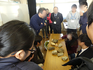 密度が高くなると硬くなるので,互いにこすり合わせたときに,硬い岩石は弱い岩石を削って粉末にします。白い紙の上でこすり合わせて,どちらの粉末が出てくるかで,相対的な硬さの順番をつけていく方法です。どちらの粉末が出てきたのかをどのように判断したのか,とか,こすり合わせ方によっては硬いほうの粉末(破片)が出てきたりはしないのか,という意見が出ましたが,粉末の内容はルーペで確認したとのことでした。岩石を重さや硬さで分けるというのは,なかなか高度な分類法です。これは,堆積物が岩石になっていく過程の状態の違いをもとに分類していることになります。