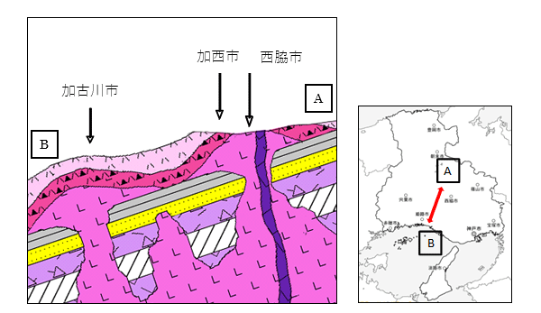 正しく説明するためには,いろいろと解決しなければならない問題がありますが,簡単に説明すると,図13のように考えられます。同時期に堆積した凝灰岩なので,北側の西脇市でも南側の高砂市でも,角礫凝灰岩の上に粗粒凝灰岩が,その上に細粒凝灰岩が堆積しています。つまり,西脇市にだけ火山灰が飛んでこないわけはないので,西脇市の角礫凝灰岩の上にも,粗粒や細粒の凝灰岩が積もっていたはずです。ところが,西脇市では角礫凝灰岩が露頭でむき出しになっていて,岩石を採取することができた。それは「なぜ」でしょうか?それは,地盤が隆起して持ち上がったために,上に積もっていた粗粒や細粒の凝灰岩が削られて(浸食作用)失われてしまったからだ,と考えられます。加西市では,上に積もっていた細粒凝灰岩が削られたが,高砂市では,地盤の隆起が起こらず,浸食が進まなかった,と考えられます。ですから,高砂市を深く掘っていくと,そのうち,粗粒凝灰岩層が出てきて,さらに掘り進めると,角礫凝灰岩層が顔を出す,つまり,北ほど隆起した可能性が岩石の観察によってわかるのです。