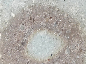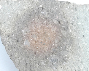 そこで,まず,普通のガスバーナーで,固定した青色凝灰岩を焼いてみます(図14)。炎の上2~3cmくらいのところに凝灰岩を固定して,3分程度加熱します。冷却して観察すると,赤く変色しているようすが確認できます(図15)。青色凝灰岩は地下で何らかの熱によって焼かれて赤くなった,と結論つけましたが,こちらから「もっと高温の炎で焼いたらどうなるだろうか?」と質問を投げかけます。生徒は,真っ黒に焦げる,真っ赤になって溶ける,など,答えました。そこで実際に,高温バーナー(市販されているガラス細工用バーナー)で青色凝灰岩を加熱してみると,中央だけが青色のままで,周囲は赤く変色します(図16)。