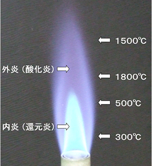 なお,グループによっては,ガスバーナーの炎の構造と温度の図を見せて説明すると,炎の中心部は温度が低いから青色のままだったのではないかという疑問を発表する生徒もいます。これは,最初に弱い炎で焼いたときに赤黒くなったことから,温度が300℃もあれば赤くなるのに十分であることがわかっていますから,高温での加熱実験は,バーナー中央部の炎の温度が低かったためではないことを示す対照実験でもあったわけです。