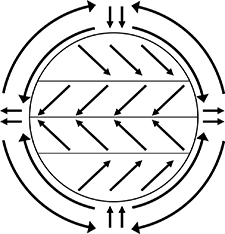 「これでは矢印が空中に伸びて宇宙に逃げていく一方,あるいはどこからともなく空気が出現したことになってしまうのでは?」とヒントを出すと,頭を抱えながらも上空の風を描き加えてくれます。偏東風・偏西風の条件を忘れている班もたまにありますが,おおよそ図3のような形に落ち着きます。