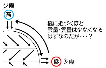 生徒たちのうち何人かは「低気圧の中心付近では上昇気流が発生し雲が発生する」という事実と関連させて,ハドレーモデルの場合だったらどのようになるのかを考えます(図4)。