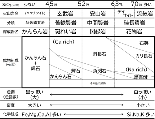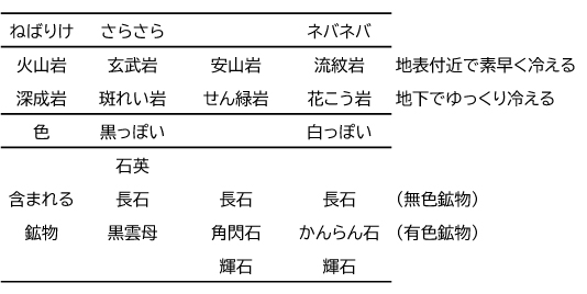 表1のような表は,あらゆる教科書で必ず目にします。一般的な火成岩の特徴が,把握しやすいように端的にまとめられています。ところがこの表を覚えているというだけではあまり意味がありません。岩石の鑑定を行う過程で,この表の活用方法の体験的理解を目指します。