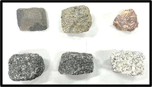 左から順に 上段:玄武岩 安山岩 流紋岩,下段:斑レイ岩 閃緑岩 花崗岩