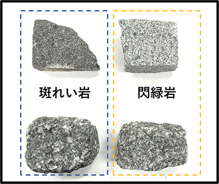 ここで「色以外に特徴はないか」と問うと,等粒状か斑状かで分類をする生徒が出始めます。しかしそれでも,明確に「白っぽくて等粒状」の花崗岩以外には確信が持てません。特にサンプルとして用意したいくつかの斑れい岩と閃緑岩のセットは,どちらが「白っぽい」のか,断言が難しいです(図7)。