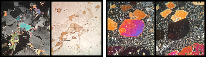 図8 左:黒雲母のクロス・オープンでの観察 右:輝石が鏡下で消光する様子