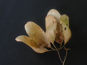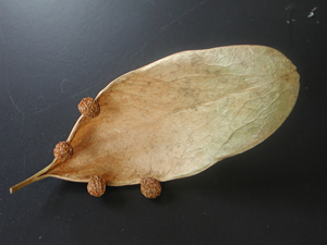 果実の中に,種子の入る部屋がいくつあるのかが,雌しべを形成する心皮の数に対応している。授業では,『花の観察学入門』を参考に,バナナとオクラの果実の断面も観察させている。バナナは輪切りにしたものを生徒に配る。皮の周りから指で軽く押してやると,3つのブロックに分かれ,3枚の心皮からなる雌しべであったことが分かる(図4)。オクラは果実の断面を見ると5枚の心皮からなる雌しべであることがわかるが,たまに,種子の入る部屋を6部屋もつものも見られる。はじめに紹介したアオギリは5枚の心皮からなる雌しべで,果実の成熟過程で子房ごとに分かれる分離果である(図5)。アオギリは樹高がかなり高くならないと花を咲かせないので,手の届く高さに果実はできない。落ちている果実から,図5のように5枚の果皮がバラバラにならずに残っているものを探すのは大変なのだが,なんとか1つは手に入れて生徒に提示したい。