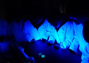 翌日以降,培地を肉眼で観察し,さらに紫外線を照射して,発光するかしないかを確認する(図3)。