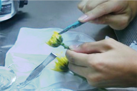 ③ キクの花弁は開ききってない内部の花弁を用いると成功率が上がる(図3,4)。1年中手に入るというメリットがある。