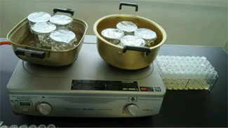 ガスコンロで湯煎を行って培地を作る(図6)。その後シャーレや試験管に分注して滅菌する。滅菌は蒸し器で40分行う。