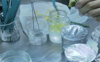③ 除菌したカミソリで外側の花弁は切り捨て,できるだけ内側のキクの花弁を切りとり,除菌スプレーの溶液入りフタ付きガラスビンに入れて3分間シェイクする(図7)。
