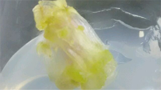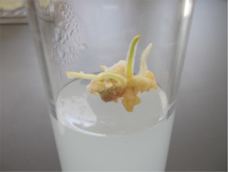 敬遠される組織培養実験の普及につながる工夫を研究開発した。長崎県高等学校理科教育研究会生物部会で先生方に行っていただいた実験でも98%の成功率であった。生徒の中には絶滅危惧種を救おうとナガサキギボウシの組織培養に挑戦してカルス化まで成功している(図12)。授業実験として十分取り入れることができる結果を出した。この方法で組織培養の基本技術を習得させ,課題研究へと発展させることが可能であると考える。