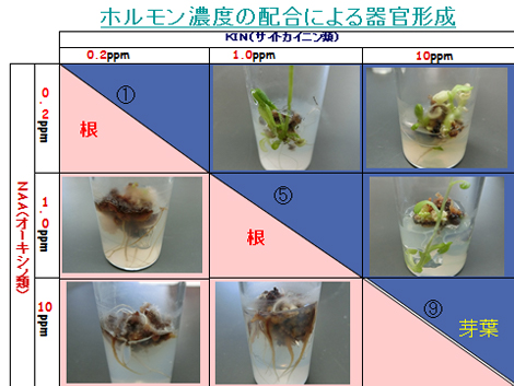⑥ 10から14日後カルスに分化したものがみられる。2日後ぐらいに無菌操作失敗したものはカビが生えてくる。