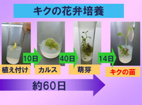 無菌操作の成否は手早くすることで雑菌が入り込むチャンスをできるだけなくすことが肝心である。今回ピンセット・カミソリの火炎滅菌も不要で,除菌した花弁を滅菌水で洗うことも不要にすることで手間を削減した。70%エタノールを使う作業も削減できた。このように手軽に行うことができた要因は除菌スプレーの活用と考える。また組織,器具などの殺菌を一括してこの100円ショップの除菌スプレーで賄えるので素人でも手早く行えることができるようになったと考える。
