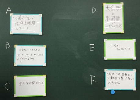 iPadをはじめとするICT機器を活用することなども考えられるが,本校ではそのようなICT機器が十分に整っている環境ではない。また,ホワイトボートは何度も書き直しができ,さらにグループのメンバーと相談しながら書き込めるため,発表するのに効率的である。ただし,A4版の大きさであるため教室の後ろの生徒には見えにくいという欠点はあるが,一つ一つ読み上げたり,グループに補足説明してもらったりすることでカバーしている。この授業を通して,胎児の心臓の仕組みを理解することが,自分自身の体を振り返り,生命の神秘を感じる生徒もいたようである。