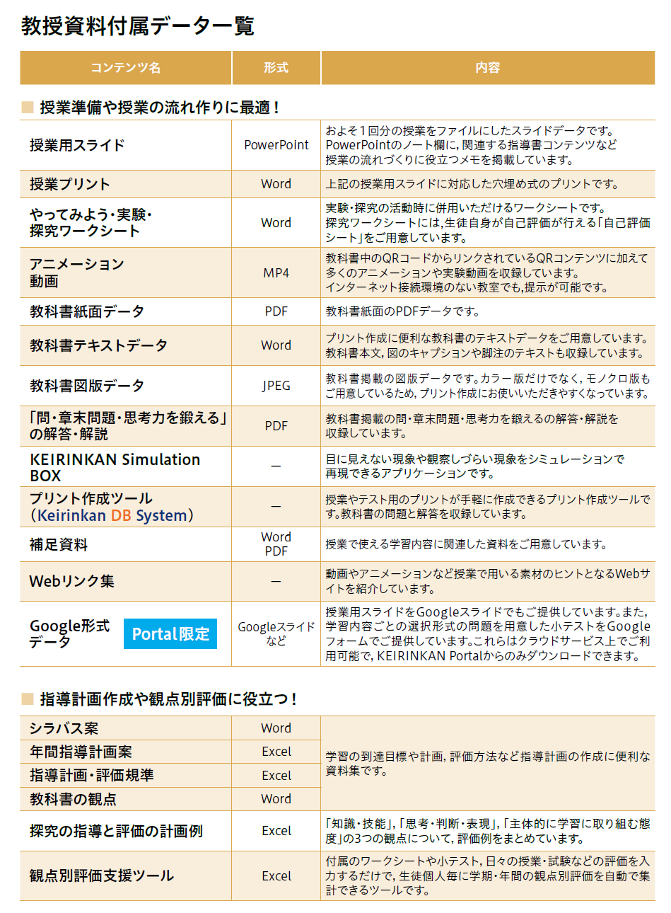 - 授業用スライド、授業プリント、実験・やってみよう・探究ワークシートWord、補足資料