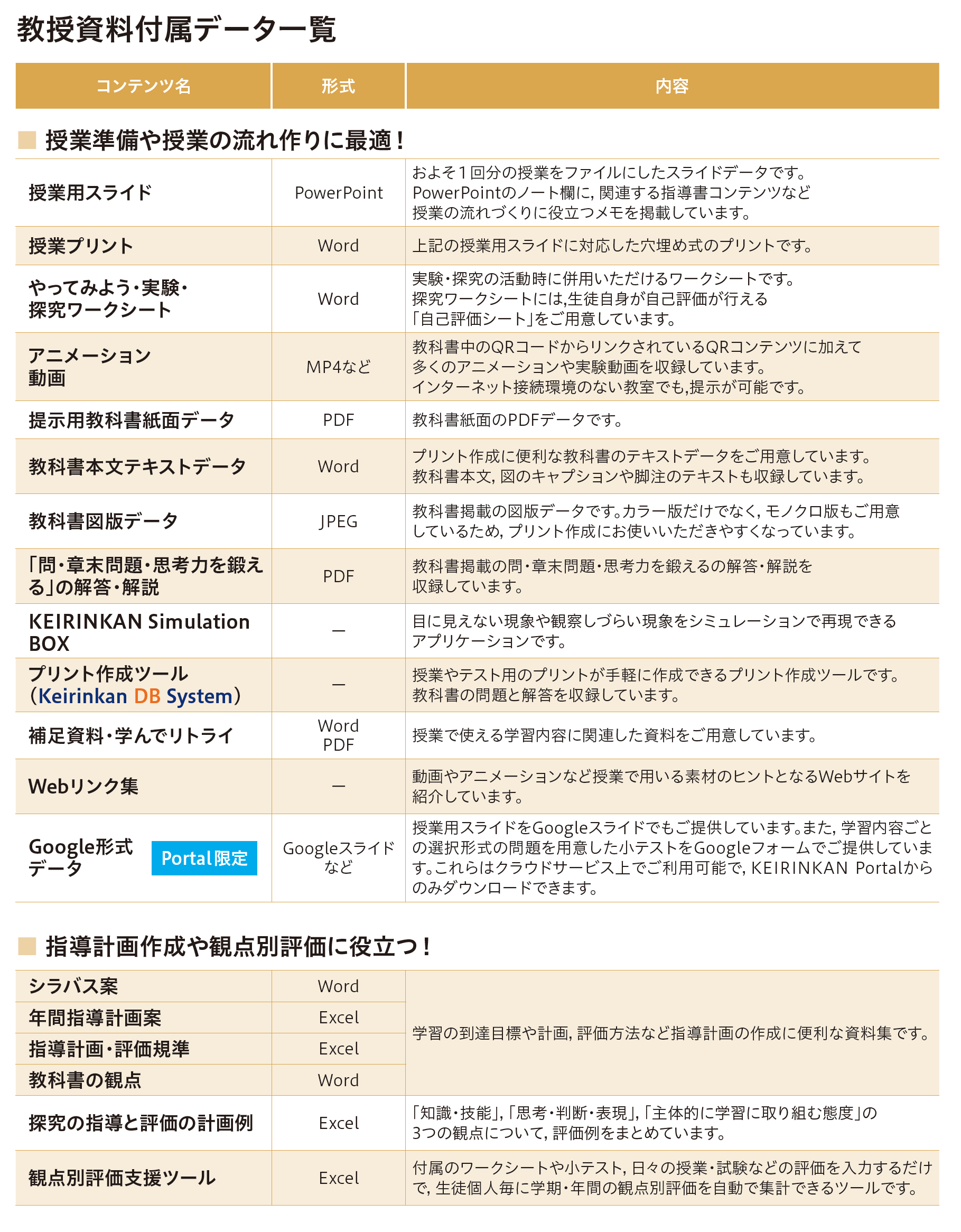 - 授業用スライド、授業プリント、実験・やってみよう・探究ワークシートWord、補足資料