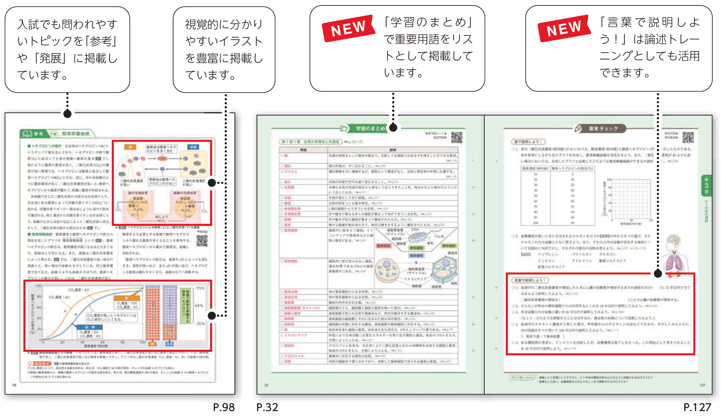 入試頻出のトピックを「参考」や「発展」に掲載しています。章末では学習内容を丁寧に振り返ります。「言葉で説明しよう!」は論述トレーニングとしても活用できます。