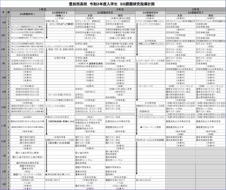 豊田西高校では,課題研究の授業を3年間で計5単位で実施している。そのうち2単位(「SS課題研究Ⅱ,Ⅳ」)は探究活動で必要となる情報的な知識及び技能を学ぶ時間であり,残り3単位(「SS課題研究Ⅰ,Ⅲ,Ⅴ」)を探究活動本体に位置付けている。1年間で1単位ずつ実施し,系統的に探究活動に取り組むことができるようにしている。3年間の指導計画(令和3年度版)は表1のとおりである。本格的な探究活動に取り組む期間を第2学年の6月から第3学年の5月までとし,第3学年の7月に実施する「SSH成果発表会」でのポスター発表を目標に段階的に探究活動ができるよう,指導計画を立てている。また,実験器具や情報機器が十分に確保できるよう,授業の時間帯を学年で分けている。