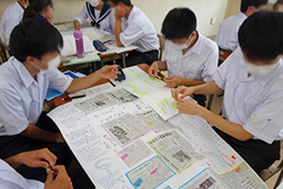 第2学年での中間発表会を経て,第3学年では改めて研究計画を立てる。その際,前年度の研究活動の反省を踏まえるとともに,中間発表会での評価や指摘を反映した計画を立てるよう指導している。この研究は第3学年の5月まで取り組み,7月の「SSH成果発表会」でポスター発表を行う(図4参照)。発表会においては,発表する3年生への指導はもちろん,聴衆となる1,2年生にも質疑応答を積極的に行うよう指導している。上級生の発表に対して質問をするには勇気が必要であり,例年質疑応答が低調に終わる傾向にある。そのため,あらかじめ発表用のポスターを見て質問を考えさせるなどの工夫をしている。