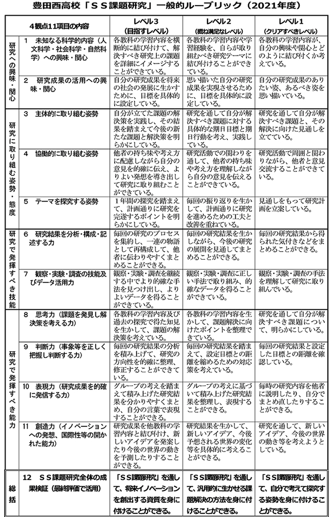 研究活動の評価に関しては,本校独自のルーブリックを用いて,自己評価及び教員による評価の両方に取り組む。令和3年度版のルーブリックを図5に示す。評価規準としては,本校SSH研究開発項目である「生徒に身に付けさせたい資質・能力(4観点11項目による評価)」に対応したものとなっている。