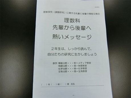 例年4月に3年生と2年生との間で,理数探究に関する情報交換会を行なっている。事前に2年生に「先輩に聞いてみたいことは何ですか?」について記入させ,当日までに3年生に渡して質問の答えを考えさせている。また,3年生は理数探究の振り返りを記入したプリント(各チームA4 1枚)を冊子にして,2年生に配付した。