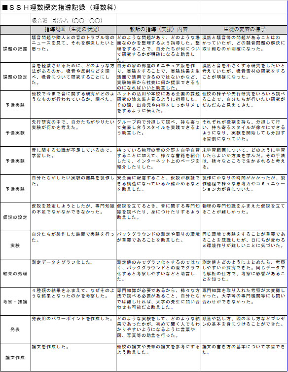 指導者一人一人は,生徒が作成する理数探究の個人記録とチーム記録,自分が指導した内容などを元にSSH理数探究指導記録を作成する。