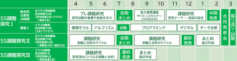 このうち「SS課題探究Ⅰ」「SS課題探究Ⅱ」は1,2年次の必修科目で,「総合的な探究の時間」の課題探究活動において「情報Ⅰ」の学習内容が実践的に役立つように指導計画を立てています。課題探究活動には「理数探究」における科学的な探究の手法を積極的に取り入れています。