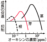 | (4) | オーキシンは茎では成長を促進する濃度でも,根では成長を( 8 )する(右図)。 |